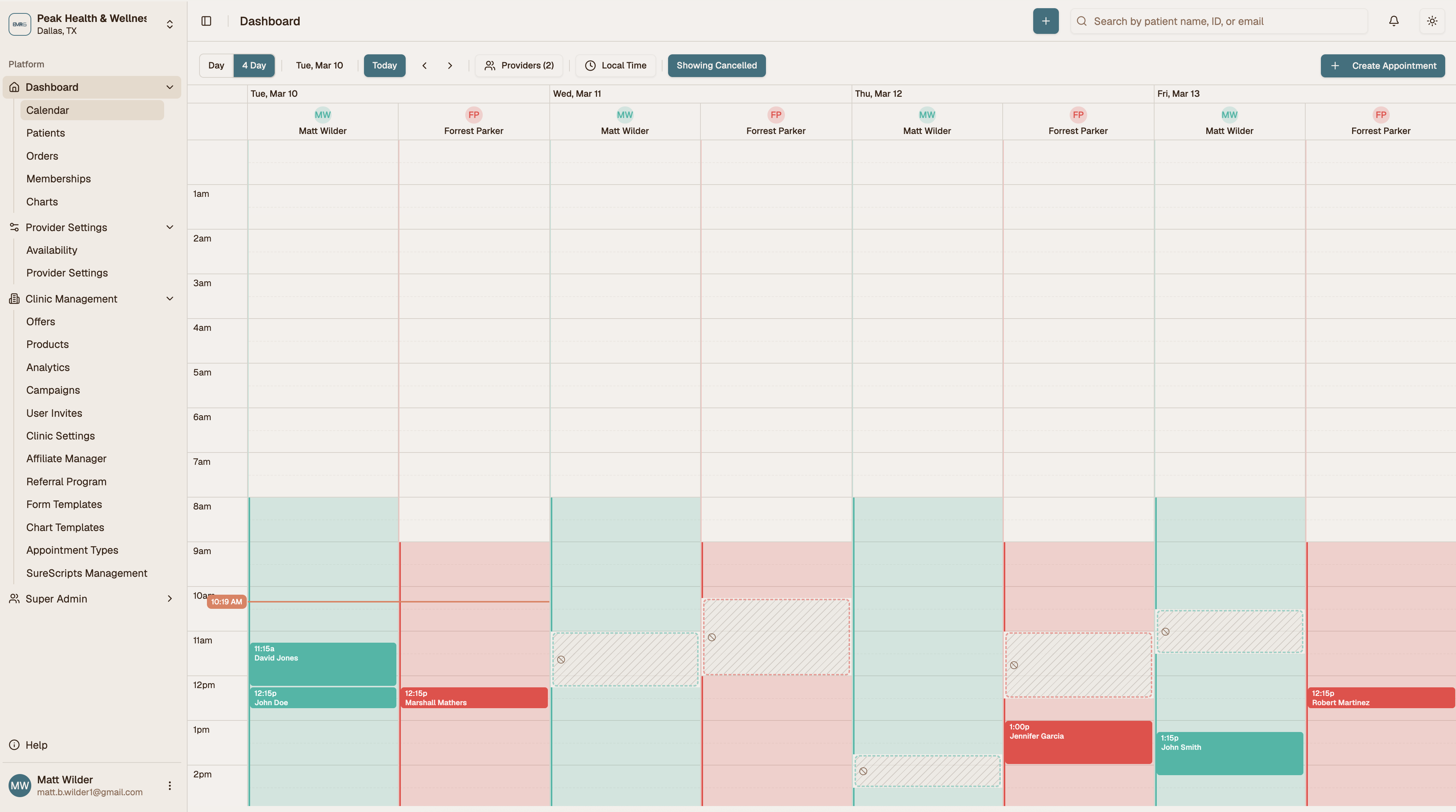 Manage providers, appointments, and availability in one view. Click any slot to book, reschedule, or chart.